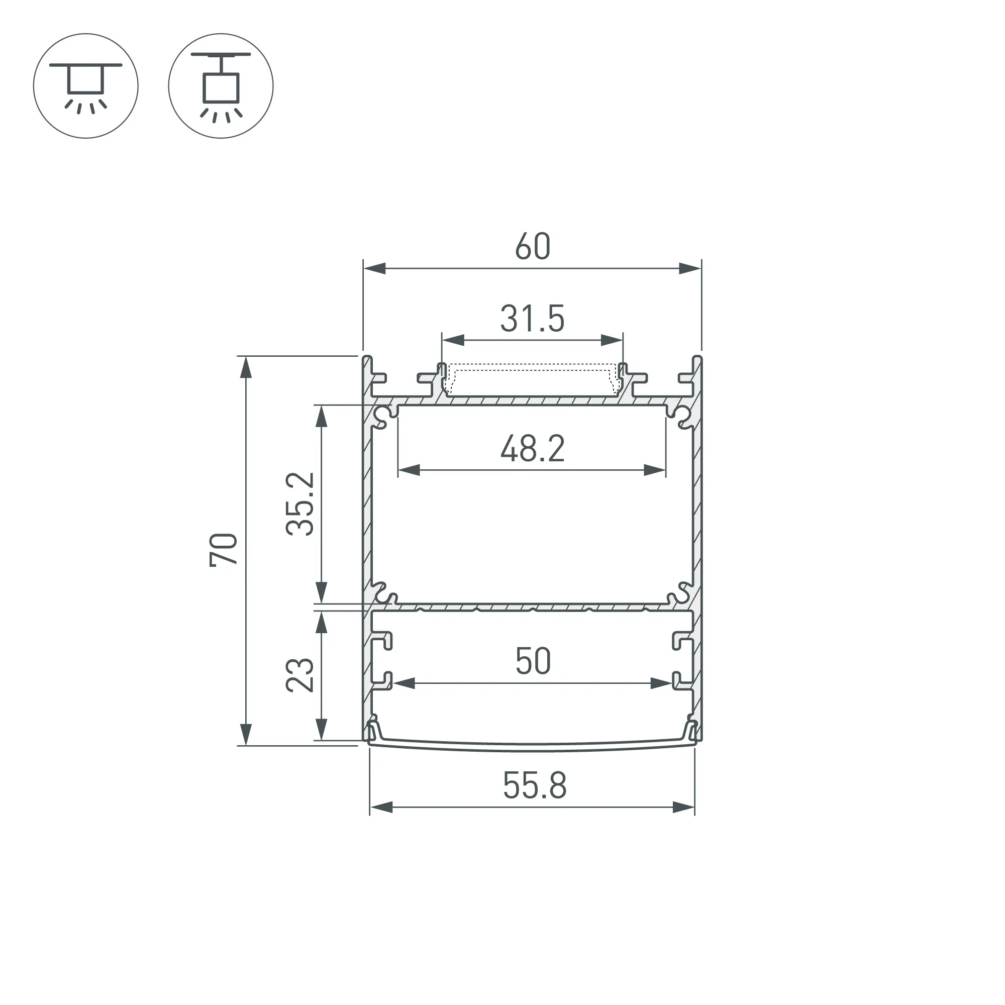 Алюминиевый анодированный профиль для светодиодных лент и линеек. Габаритные размеры (L×W×H): 2000x60x70 мм. Ширина площадки ленты направленного света 50 мм, отраженного света - 31.5 мм. Отсек для БП 48,2х35,2 мм. Экраны, заглушки и другие аксессуары приобретаются отдельно. Цена за 1 метр.