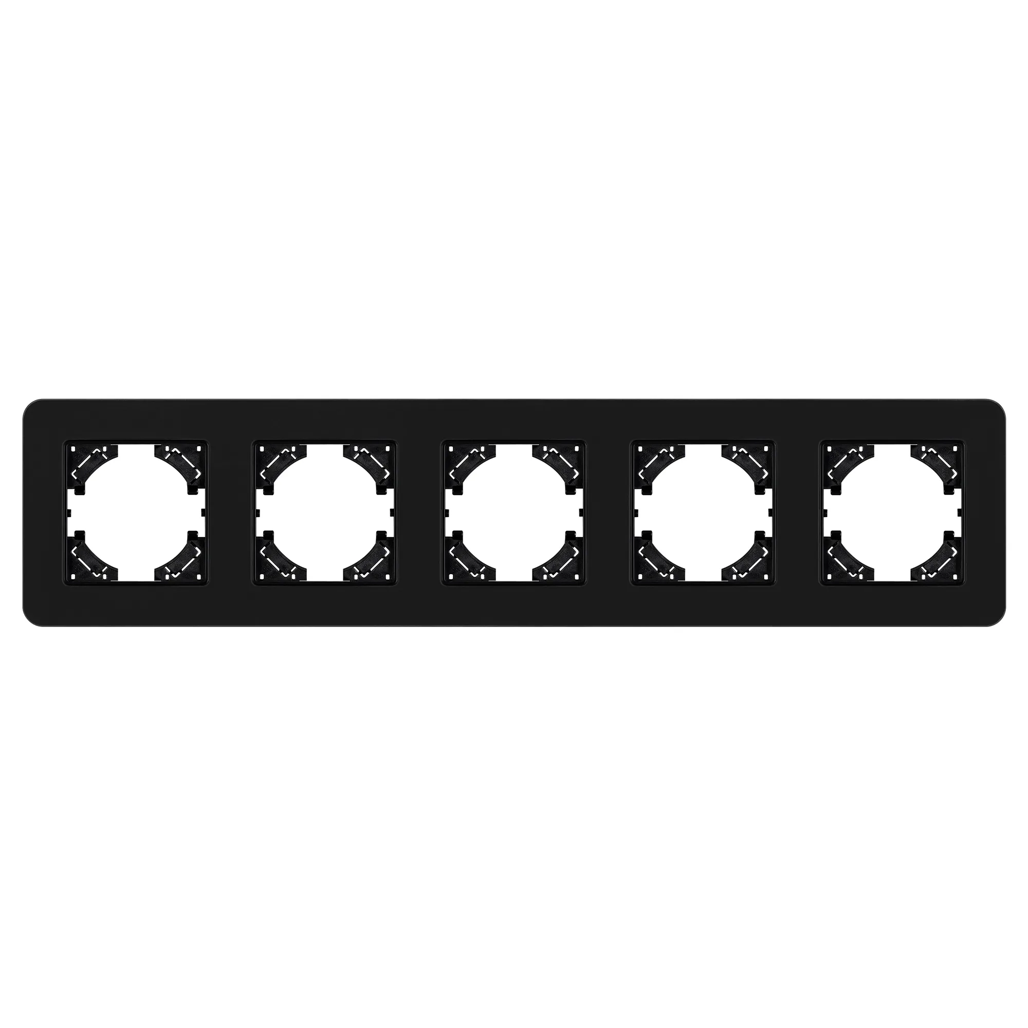Рамка стеклянная на 5 постов, под встраиваемый механизм. Цвет - черный с Soft-Touch покрытием. Уровень герметичности IP20. Ориентация монтажа - горизонтальная (основным ориентиром служат посадочные выступы для накладки механизма).