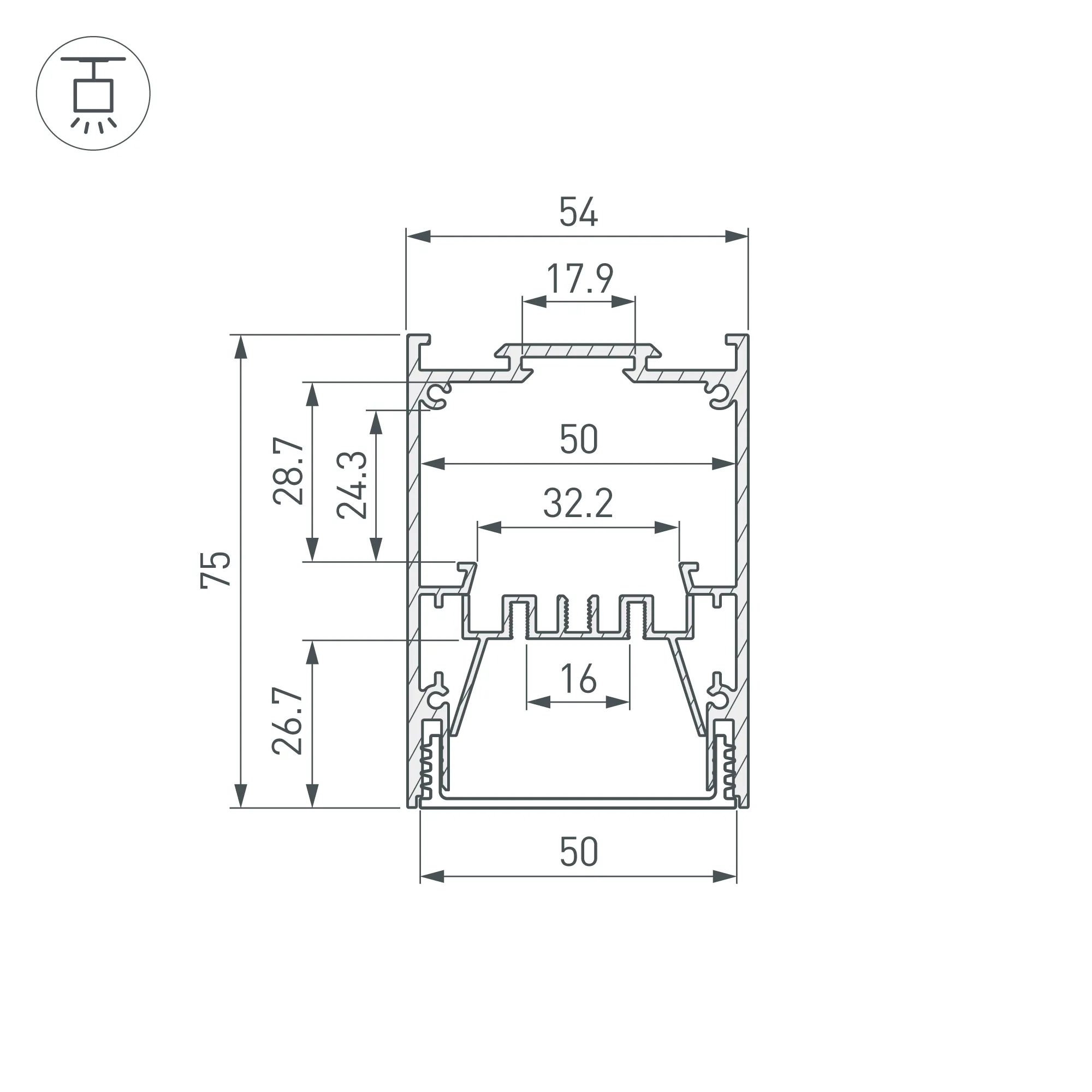 Алюминиевый профиль для светодиодных лент и линеек с возможностью герметизации до IP65. Цвет - чёрный (порошковая окраска), покрытие - зернистое. Габаритные размеры профиля (L×W×H): 2000x54x75 мм. Ширина площадки для ленты 16 мм. Экраны, заглушки и другие аксессуары приобретаются отдельно. Цена за 1 метр.